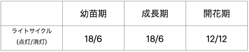 屋内で大麻を育てる場合、成長期ではライトの点灯時間を1日のうち18時間をオンに設定します。(6時間は完全な暗闇)